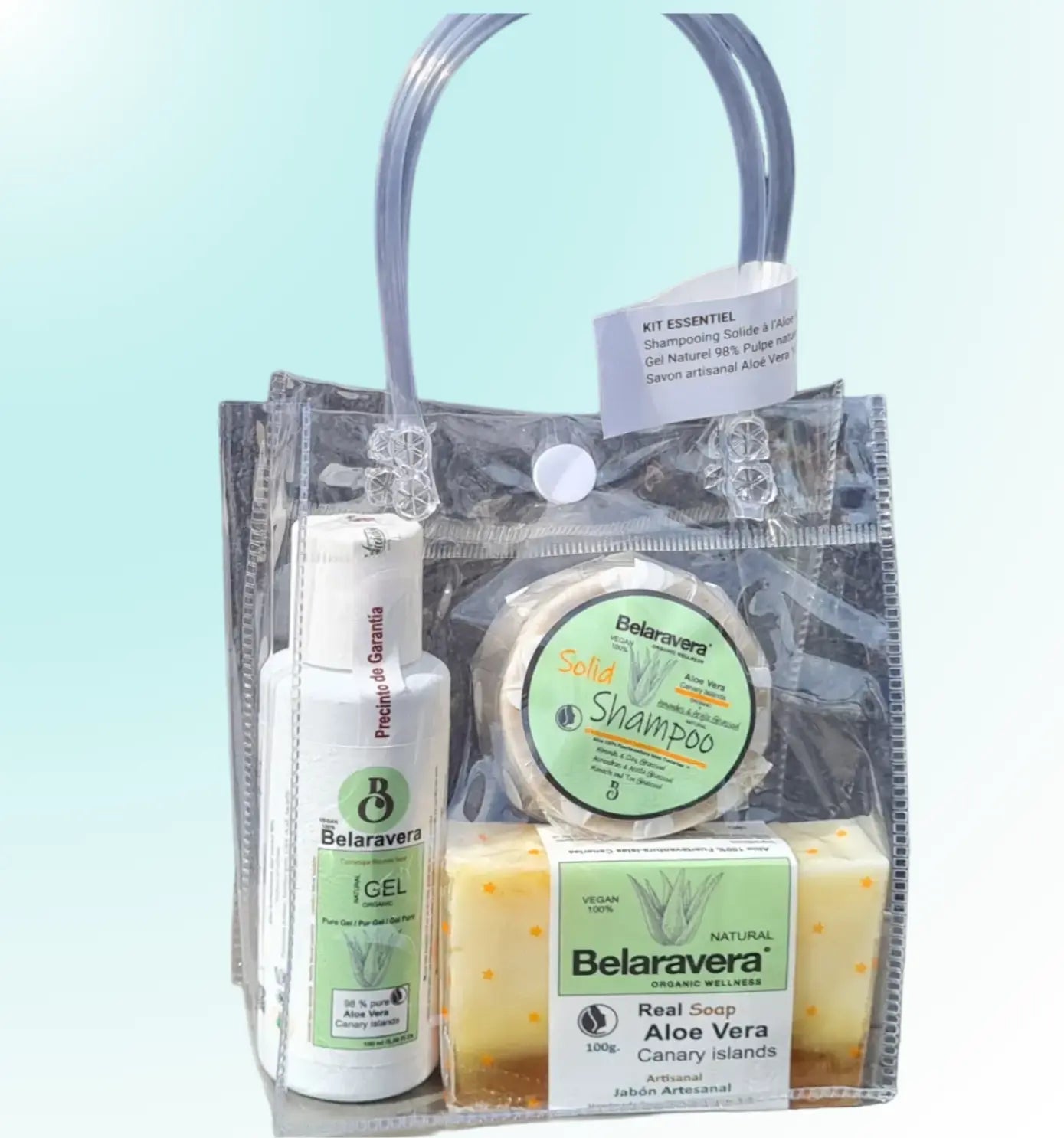 Le kit de voyage Belaravera comprend trois produits à base d'aloe vera écologique, parfaits pour le soin et le nettoyage quotidien de la peau. Les formats sont conformes aux normes de bagage à main, ce qui le rend idéal pour vos voyages.